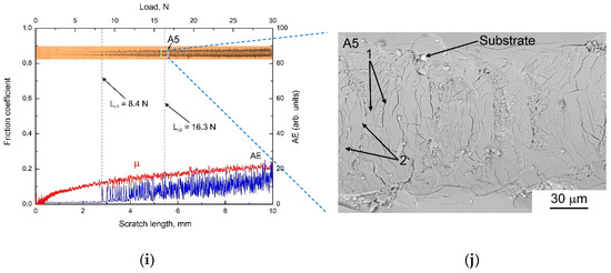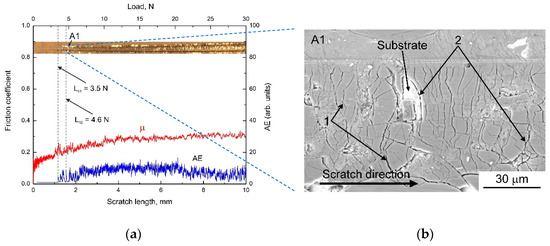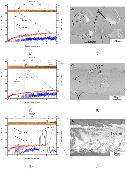 The scratch tests were performed with a Revetest scratch tester (CSM instruments, Peseux, Switzerland) using a conical Rockwell indenter with an apex angle of 120° and a tip curvature radius of 200 µm. Three tests were carried out for each sample. The scratches were made 10 mm long with a sliding speed of 2 mm/min and a loading rate of 6 N/min. The maximum applied normal force was 30 N. The friction coefficient (µ) and the acoustic emission signals (AE) were recorded during the tests. Each failure event during scratching such as cracking and delamination of a coating results in acoustic emission output induced by the generation of transient elastic waves produced by a sudden redistribution of stresses. The magnitude of an AE signal is proportional to the area of a crack generating the signal. Three critical loads were determined to characterize the coating failure during scratching. The first critical load (Lc1) corresponded to the first crack event inside the scratch tracks. The second critical load (Lc2) was identified as the load at which the first sporadic local delamination of the coatings with substrate exposure occurred inside the tracks. The third critical load (Lc3) was attributed to the beginning of the continuous delamination of the coatings. The critical loads were determined by monitoring the coating failure using the acoustic emission technique and fluctuations of the friction coefficient with the following confirmation by optical microscopy and scanning electron microscopy. The examination of the resulting scratch grooves was carried out using an Axiovert 40 Mat microscope (Carl Zeiss, Jena, Germany) and a Carl Zeiss EVO 50 scanning electron microscope (SEM, Carl Zeiss, Jena, Germany).