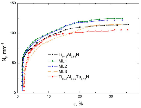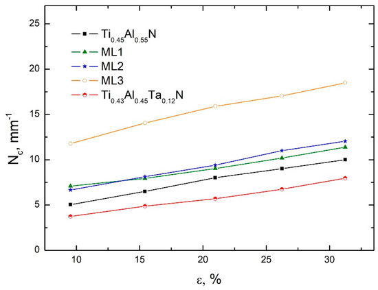Four consecutive failure stages were revealed under uniaxial tension of all the samples studied. The critical strains corresponding to the onset of these stages (εI–εIV) are listed in Table 2. Stage I (primary cracking) began with sudden appearance of numerous cracks oriented perpendicular to the tensile axis (transverse cracks) (Figure 3a). It has been shown that such cracks provide relaxation of the tensile stress only near the free edges of the coating fragments, while the stress rapidly increases at a distance from the edges [56]. Therefore, stage I was characterized by sharply increasing crack density Nt (the number of cracks per unit length of the samples) with increasing substrate elongation (Figure 4). This resulted in the formation of a system of parallel cracks, which distribution was initially random, but became quasi-periodical to the end of stage I. The reason for this is that the tensile stress reaches its maximum value at the middle point of the coating fragments [56]. Therefore, the formation of new cracks becomes increasingly probable at this point. The Ti0.45Al0.55N, ML1, and ML2 coatings exhibited the similar crack multiplication rate at stage I. The crack multiplication rate was lower for the Ti0.43Al0.45Ta0.12N and ML3 coatings, but the duration of stage I increased, especially in the case of the ML3 coating. As a result, the Ti0.45Al0.55N, ML1, ML2, and Ti0.43Al0.45Ta0.12N coatings were characterized by close Nt values (61–65 mm−1) to the end of stage I, while the crack density in the ML3 coating was 49 mm−1.