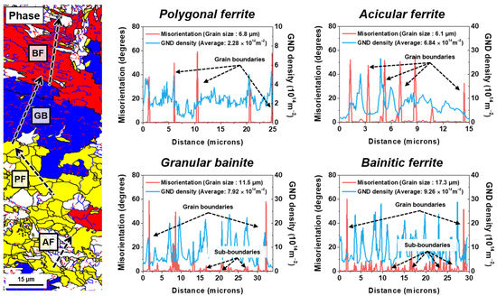 EBSD grain boundary map with colorized constituent and misorientation along with the geometrically necessary dislocation (GND) density of the polygonal ferrite, acicular ferrite, granular bainite, and bainitic ferrite in the training data sample 6.