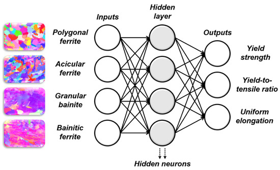 In this study, a back-propagation algorithm and the sigmoid function were used for the development of the ANN. The training program of the present ANN model was written in C [26,31,32]. The ANN model consists of four neurons (the fraction of PF, AF, GB, and BF constituents) in the input layer and three neurons (yield strength, yield-to-tensile ratio, and uniform elongation) in the output layer as shown in Figure 2.