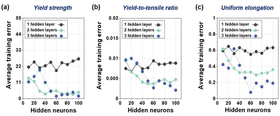 Variation of average training errors as a function of hidden layer and neuron for the (a) yield strength, (b) yield-to-tensile ratio, and (c) uniform elongation.