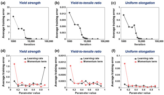 Variation of average training errors as a function of the (a–c) iteration and (d–f) learning rate and momentum term for the (a,d) yield strength, (b,e) yield-to-tensile ratio, and (c,f) uniform elongation.