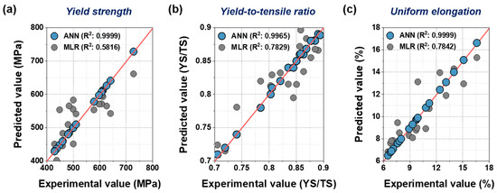 Comparison of prediction ability of the developed artificial neural network (ANN) and multi linear regression (MLR) models of high-strength, low-carbon bainitic steels: (a) yield strength, (b) yield-to-tensile ratio, and (c) uniform elongation of the training datasets.