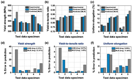 Comparison of (a–c) experimental and predicted tensile properties, and (d–f) percent error in prediction of the tensile properties of the developed artificial neural network (ANN) and multi linear regression (MLR) models for the testing datasets of high-strength, low-carbon bainitic steels. The respective average percent errors for predicted tensile properties of the testing datasets were indicated in parentheses in Figure 6d–f.