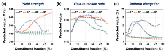 Predicted (a) yield strength, (b) yield-to-tensile ratio, and (c) uniform elongation of the samples with the lowest yield strength, the highest yield-to-tensile ratio, and the lowest uniform elongation, respectively, as a function of the fraction of polygonal ferrite, acicular ferrite, granular bainite, and bainitic ferrite constituents, keeping fraction of other constituents.