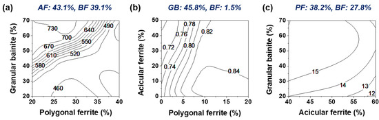 Based on the results in Figure 7, which show the effects of a single input parameter on the output parameters, the effects of multiple input parameters on the yield strength, yield-to-tensile ratio, and uniform elongation were analyzed and summarized in Figure 8. The contour map allows the visual inspection to select the desired tensile properties. Figure 8a shows the predicted yield strength as a function of the variation in the fractions of the PF and GB at fractions of 43.1% AF and 39.1% BF. The yield strength tended to increase with a decrease in the PF fraction and with an increase in the GB fraction. The predicted yield-to-tensile ratio as a function of the variation in the fractions of PF and AF at fractions of 45.8% GB and 1.5% BF is shown in Figure 8b. It can be seen that the yield-to-tensile ratio decreased with an increase in the AF fraction and a decrease in the PF fraction. Meanwhile, as shown in Figure 8c, which presents the predicted uniform elongation as a function of the variation in the fractions of AF and GB at fractions of 38.2% PF and 27.8% BF, the uniform elongation tended to increase as the AF and GB fractions decreased. As a result, these maps of the predicted tensile properties will provide insight into the constituent fraction needed to make the desired high-strength, low-carbon steel with higher deformability.