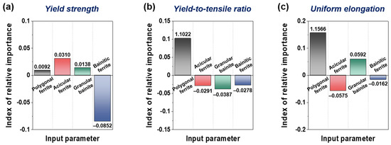 Figure 9 shows the average IRI of the input parameters of the PF, AF, GB, and BF fractions for the yield strength, yield-to-tensile ratio, and uniform elongation for all datasets. For the average IRI for the yield strength (Figure 9a), PF, AF, and GB had positive effects, while BF indicated a negative effect. In particular, it was found that increasing the AF fraction was effective in improving the yield strength. With regard to the yield-to-tensile ratio (Figure 9b), the PF and bainitic microstructures (AF, GB, and BF) had the opposite effect, and the yield-to-tensile ratio decreased with an increase in the fraction of the bainitic microstructures (AF, GB, and BF). Meanwhile, as shown in Figure 9c, the PF and GB had a positive effect, whereas the AF and BF exhibited negative effects on the uniform elongation. In particular, the PF had a strong effect on the uniform elongation compared to the other input parameters.