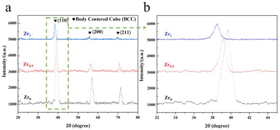 Figure 1 shows the XRD pattern of (a) the TiMoNbZrx high-entropy alloy and (b) an enlarged view of the main diffraction peak. It can be seen from Figure 1a that the alloys after Zr addition were composed of a single BCC phase. As shown in Figure 1b, upon increasing the Zr content, the main diffraction peak of the BCC phase shifted to a lower diffraction angle, and the lattice constant of the alloy increased, with lattice parameters of 3.26 Å, 3.28 Å, and 3.29 Å for Zr0, Zr0.5, and Zr1, respectively. The atomic sizes of Ti, Mo, and Nb are 1.47, 1.47, and 1.4, respectively, which are similar, while Zr has an atomic size of 1.6, which is much larger than that of Ti, Mo, and Nb; thus, the lattice distortion of the alloy increased upon increasing the Zr content.