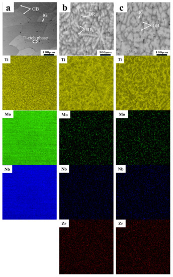 SEM was used to characterize the microstructure of the TiMoNbZrx high-entropy alloys. The SEM image and EDS analysis of the alloy are shown in Figure 2 and Table 1. Figure 2a shows that the structure of the Zr0 alloy is a typical equiaxed crystal, with an average grain size of 200 μm. In addition, some black precipitates (volume fraction of approx. 0.42% by ImageJ software) appeared in the grains, which is known to be a Ti-rich precipitate according to Ref. [38]. Zr0.5 alloy displayed a dendritic morphology, with disordered grains with a size range of 40–80 μm (Figure 2b). It can be observed from Figure 2c that the Zr1 alloy has an equiaxed crystal morphology, with an average grain size of 120 μm. This shows that the dendritic morphology of the as-cast alloy was quite different from that of alloys with different Zr contents. Upon increasing the Zr content, the alloy grain size first decreased and then increased.
