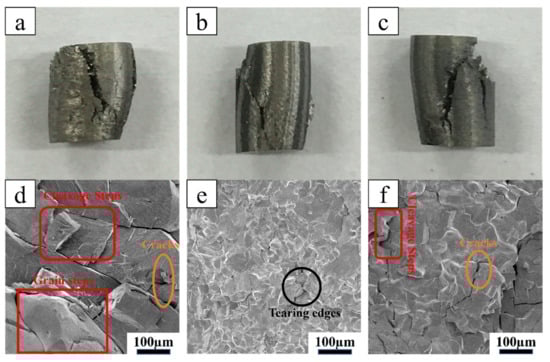 Photos and SEM images of the fractured TiMoNbZrx HEAs: (a,d) Zr0; (b,e) Zr0.5; (c,f) Zr1.