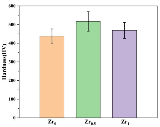 The hardness of a material is an important indicator of its wear resistance. Before the wear tests, the room-temperature hardness of TiMoNbZrx was measured, and the results are shown in Figure 5. The hardness of Zr0, Zr0.5, and Zr1 alloys were 438 ± 38, 516 ± 52, and 489 ± 43 HV, respectively. As observed, the hardness of the alloys increased first and then decreased upon increasing the Zr content, and the hardness of the Zr0.5 alloy was the largest. According to the solid solution strengthening formula [46],