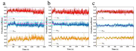 Friction coefficients versus time for the TiMoNbZrx HEAs under different loads: (a) 30 N; (b) 50 N; (c) 100 N.