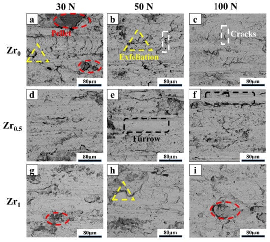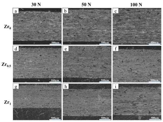 SEM image of the wear tracks of the TiMoNbZrx HEAs under loads of 30, 50, and 100 N: (a–c) Zr0; (d–f) Zr0.5; (g–i) Zr1.