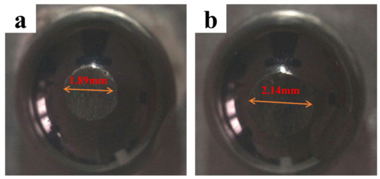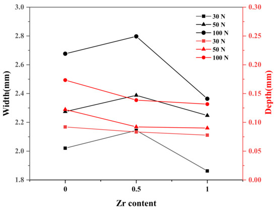 Furthermore, the wear of the grinding balls under different loads was analyzed, and the optical microscope images are shown in Figure 9. The cross sections of the wear on the alloy grinding ball were all round, at 30 N, 50 N, and 100 N. As for the Zr0 alloy, the diameters of the grading ball wear surface were 1.79, 1.89, and 2.33 mm, respectively. As for the Zr0.5 alloy, the diameters of its grading ball wear surface were 1.82, 2.14, and 2.49 mm, respectively. As for the Zr1 alloy, the diameters of its grading ball wear surface were 1.80, 2.11, and 2.17 mm, respectively. According to these results, a proper amount of Zr alloying improved the wear resistance of the Zr0 alloy, which is consistent with the wear scar analysis. In addition, the width and depth of the sample wear scar were measured by a profiler and plotted in Figure 10. The Zr0.5 alloy had the greatest width under different loads, while the depth was relatively shallow, which once again shows that a proper amount of Zr alloying improved the wear resistance of the Zr0 alloy.