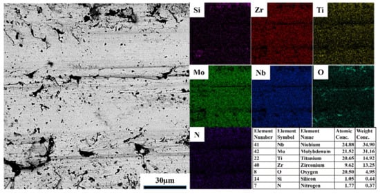 To explore the reasons for its excellent wear resistance and wear mechanism, the Zr0.5 alloy wear scar morphology under a 100 N load was characterized by SEM, and SEM-EDS (Figure 11). As observed, Ti, Mo, Nb, and Zr elements were concentrated in the smooth and flat area, and N and Si were segregated in the black area. In addition, a large amount of oxygen was found, whose mole fraction was as high as 20.50%. Due to the nature of Zr, it is easily oxidized and binds to atmospheric oxygen to form large amounts of oxides, which can act as a lubricant that reduces the friction [37] and the wear rate of the Zr0.5 alloy.