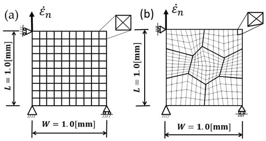 Figure 1 shows two-dimensional rectangular block samples of a single and a polycrystal TRIP steel undergoing plane strain tension. The finite element discretization with the crossed triangular plane strain element was applied. The quadrilateral element consisted of 4 triangular plane strain elements with 5 nodal points. The position of the central node could be automatically determined from an intersection of two diagonal lines. Each triangular element was regarded as one crystal lattice, and only 4 Gaussian integration points at the center of each triangular element were sufficient to evaluate the transformation criterion. Since only one variant system was formed in one crystal lattice, the summation on the variant systems in Equations (7)–(9), (11), (14) and (15) could be neglected.