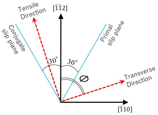 On the other hand, the two-planar slip system proposed by Asaro [], in which the angle between two slip systems is , was applied as shown in Figure 2. The initial crystallographic orientation was determined by the rotation angle between the x-axis and the slip plane as the median between the two slip systems. On the (111) plane for the two slip system, three different initial crystal orientations, given in terms of Euler angles, were considered as , , . For convenience, the initial crystal orientation is denoted by , , and from this point onwards. In the monocrystal model, the same was set over all of the finite elements. The length and width of the block were 1.0 and 1.0 mm, respectively, and the nominal strain rate of was given at the room temperature .