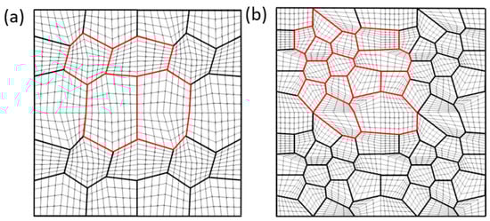 Based on the flexible approach of the Voronoi tessellation method, the polycrystal model could be formed to describe the natural morphology with any number of grains. Here, to satisfy the conditions for periodicity, the polycrystalline models were formed in such that the numbers of nodes of elements on opposite sides were equal. This condition ensured the continuity of the unit cell in the infinite medium. Next, for the purpose of establishing a clear difference in the numbers of grains, and to ensure an effective computational cost, polycrystal models with 4 and 14 grains were formed. Figure 3 presents two sets of tessellations with 4 and 14 grains included for periodicity. A crystalline grain can be considered for each Voronoi polygon. In the simulation, a unit cell was considered as a one-quarter part from the Voronoi tessellation, as shown in Figure 1b. The Voronoi polygon was discretized by quadrilaterals to indicate the mesh. It is important to mention again that there was no grain boundary effect included in the numerical framework in this study, which was based on conventional CPFEM. The different behaviors of the polycrystal model, with different numbers of grains, were induced by the CA approach.