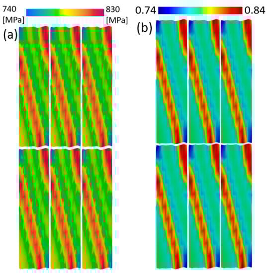 Figure 5 presents the distribution of (a) equivalent stress and (b) equivalent plastic strain of single crystal unit cells in an infinite medium when six-unit cells were arranged in an orderly manner and at . The color bars, which indicate the range of equivalent stress and equivalent strain, are shown at . Here, the red and blue colors denote the higher and lower equivalent stress or equivalent plastic strain, respectively. As shown in Figure 5, the higher equivalent stress and the higher equivalent plastic strain appear as band structures. In addition, the cells can be matched well with each other, which evidences that the periodicity was applied successfully. Consequently, the band structures appeared periodically from one cell to another in the infinite medium.