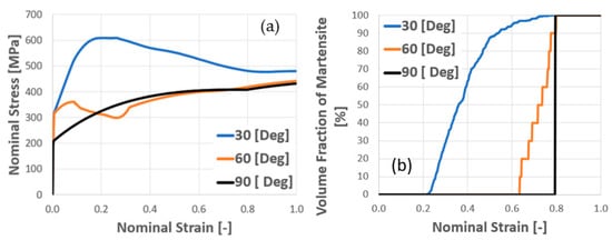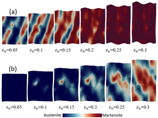 Figure 6a,b present the relationship of nominal stress and nominal strain, and the total martensitic volume fraction versus nominal strain, with different initial crystallographic orientations or parent austenitic phase. As shown in Figure 6a, the stress-strain responses depended strongly on the initial crystal orientations of the parent phase. Additionally, the nominal stresses of each case of the crystal orientation became convergencet at . It is possible that after MT was completed, the level of stresses converged with the hardening of martensite.