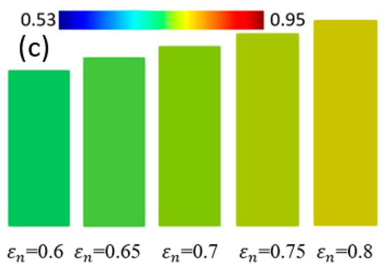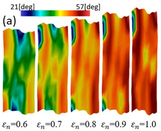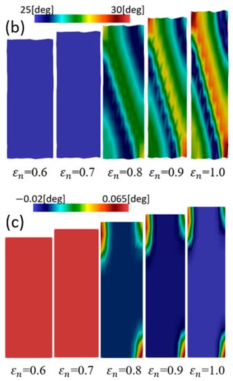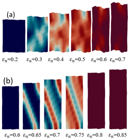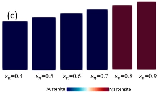 Figure 7 illustrates the distribution of martensitic phase of single crystal TRIP steel in various initial crystal orientations. In this figure, the blue and red colors indicate the pure austenite and pure martensite phases, respectively. The variations of nominal strain in each case are different due to the MT process that corresponds to Figure 6b. In Figure 7a, as , the martensitic phases were formed heterogeneously. On the other hand, in the case of , the evolution of martensite begun nucleation and expanded rapidly. In particular, the martensitic phase appeared as the band structures from . On the other hand, when , the martensitic phase occurred over the entire region at . Although both initial crystal orientations of and provide inhomogeneous deformation, the band structures could be observed in the case of , while the band structure could not be clearly observed in the case of due to the heterogeneous nucleation of the martensitic phase.