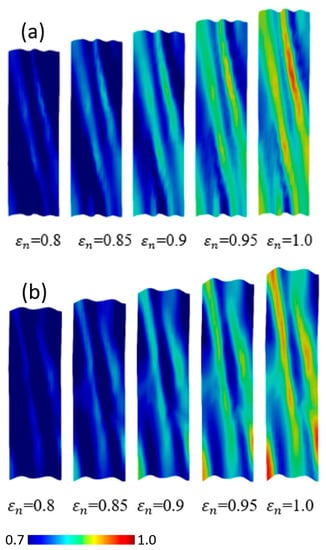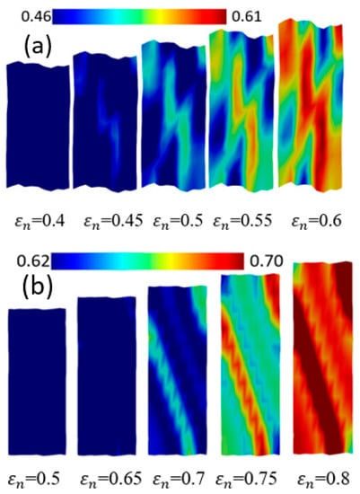 In addition, Levitas et al. [] qualitatively demonstrated that the regions of shear band intersections are favored for transformation works. Transformation work depended significantly on the number of active shear band intersections as the macroscopic strain increased. In the case of , the higher number of shear band structures led to an increase in the number of the active shear band intersections. Consequently, the necessary transformation work could be provided, and phase transformation occurred earlier compared to the process in the case of . In practice, during plastic deformation, -martensite can contain a small fraction of the total shear band structure, and -martensite can be formed quickly at the intersections of -martensite where two intersecting -martensite laths are formed. Figure 8a,b illustrate that there was an implicit appearance of strain-induced -martensite inside the generation of the huge shear bands. The results are consistent with the findings in the work of Levitas et al. []. When , the distribution of equivalent plastic strain appeared uniformly. Additionally, the region with higher equivalent plastic strain could be seen when when the phase transformation was finished.
