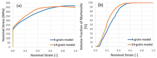 Polycrystal materials are composed of many crystallites that vary in size and orientation. In this section, a numerical analysis of polycrystal TRIP steel is presented. Figure 10 presents (a) the nominal stress versus nominal strain and (b) the martensitic volume fraction and nominal strain of 4 and 14-grain polycrystal models with the initial crystal orientations are assigned randomly from to for each grain.