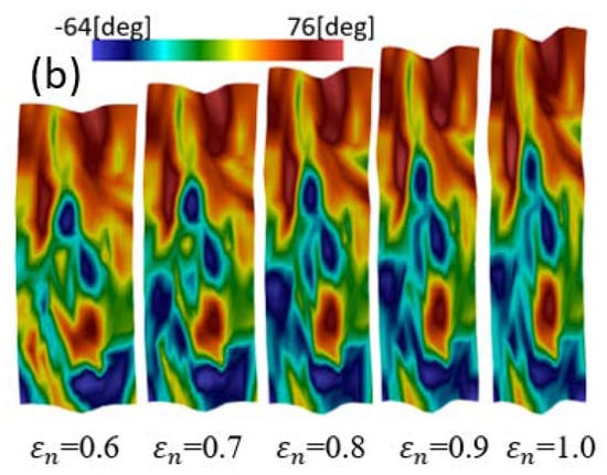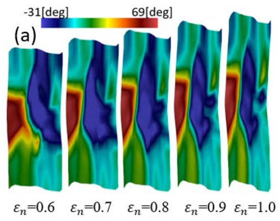 Figure 12 illustrates the distribution of the rotation angle of the transformation variant of polycrystal TRIP steel for different numbers of grains when the initial crystallographic orientations were given randomly as . In this figure, the counter-clockwise direction indicates the positive side. As predicted, the regions with higher rotation angles were very different between the two cases. The martensitic phase and the transformation strain had a significant effect on the distribution of the rotation angle of the transformed variant. Consequently, the values of the rotation angles were increased with the promotion of distortion of the grains. In the case of the 14-grain model, the ranges of high rotation angles of the transformation variant were greater than those in the 4-grain model, and the highest rotation angle of the transformation variant in the 14-grain model was also higher than that of the 4-grain model. The clear difference between the distributions of rotation angles of the transformation variant in the two cases might have been caused by the misorientation among the grains. The mismatching effect among the grains in the case of the 14-grain model was much greater compared to that of the 4-grain model.