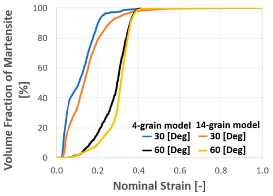 From the macroscopic point of view, it was predictable that the results of both models coincided since the perfect textures were similar. However, from the microstructural point of view, there were clear differences in the evolution of the martensitic phase and the strain level, with saturation between the 4- and 14-grain models, as shown in Figure 13. In addition, compared with Figure 10b, the saturation process in the martensitic volume fraction of polycrystal materials with a preferred orientation is faster than the saturation process of polycrystalline as the crystal orientations are given randomly. The mismatch in orientations between the grains is one possible reason that an effect was induced that could suppress the phase transformation process.