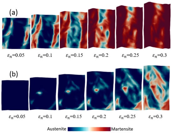 When and , the regions with higher equivalent plastic strains appeared as the shear band structures and expanded to larger sizes with the promotion of deformation. Additionally, the shear band intersections could be observed in both cases. However, the number, the width, and the length of the shear band intersection in the case of were larger than those of the shear band intersections in the case of . Importantly, upon comparison with Figure 7a,b, respectively, it can be seen that the areas of the martensitic phase corresponded with the regions of higher equivalent plastic strain. It is highly possible that the austenite near regions with higher equivalent plastic strain was transformed into martensite in a further deformation process. The MT progressed in a similar manner to a chain reaction under the straining process. This result shows that the SIMT behavior is described successfully in this study.