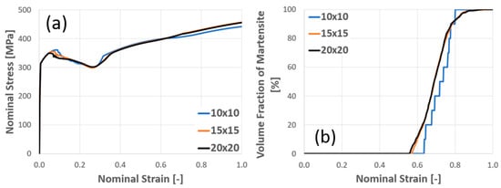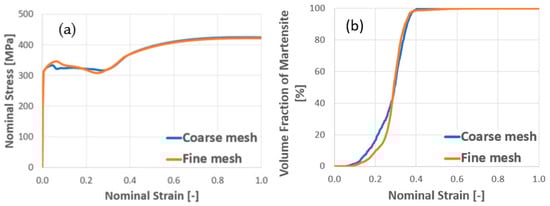 As shown in Figure 20, at , the nominal stresses and evolutions of martensite were very similar for both mesh sizes. However, differences could be seen at when phase transformation occurred. In Figure 20b, it can be seen that the saturation level of martensite in the case of the fine mesh model is slower at , but it proceeds faster in the subsequent process, with a value of .