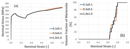 Next, a comparison of the sizes of unit cells of single crystal TRIP steel is presented in Figure 18. The sizes of the cells are considered at three level, at 0.1 × 0.1, 0.5 × 0.5 and 1.0 × 1.0 mm, with . From Figure 18a, it can be seen that the nominal stresses for all three cell sizes were quite similar. However, as phase transformation occurred at , the nominal strain of the large 1.0 × 1.0 mm cell was slightly lower than those of the two other cases. Although the nominal stresses of the 0.1 × 0.1 and 0.5 × 0.5 mm cells were almost the same, the evolutions of the martensitic phase appeared to be different.