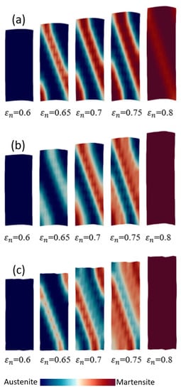 Figure 19 shows the distribution of martensitic phase for different cell sizes. For all cell sizes, the band structure corresponding to the martensitic phase can be observed. When nominal strain , the saturation levels of martensite for the 0.5 × 0.5 and 1.0 × 1.0 mm cells were completed, but in the case of 0.1 × 0.1 mm cell, the MT was not finished. Moreover, the amounts of martensitic phase and the widths of the band structures at the same nominal strain for all three cell sizes were clearly different. This demonstrates that the cell size and the size of the embryo influence the SIMT process.