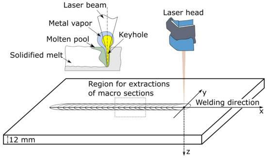 The high degree of focusability and radiation intensity of the laser beam lead to the formation of a cavity within the molten pool, called a keyhole. A cavity-enhanced optical absorption, known nowadays in laser beam welding (LBW) as the keyhole mode technique, was recognized for its high energy efficiency about 50 years ago [1]. Within the keyhole, multiple-reflection and correspondingly multiple-absorption events are observed, resulting in the enhanced optical absorption. Hereby, the total amount of absorbed energy, determined mainly by the keyhole geometry, increases, allowing for the joining of high-thickness components. More recently, the single-pass LBW of thick weld samples, with reachable thickness of up to 50 [2], was enabled by the keyhole mode technique and the rapid development of modern laser systems with available laser power of up to 100 [3,4,5]. Furthermore, the unique and well-known technical advantages offered by the LBW process, e.g., low distortion and narrow heat affected zone (HAZ), allowed for a drastic increase in the industrial productivity. Hence, at the present time, the LBW process finds application in the shipbuilding and aerospace industries, in the production of thick-walled structures, such as pipelines for the oil and gas industry, or even in the manufacturing of vacuum vessels and correction coils for the International Thermonuclear Experimental Reactor (ITER) [6,7,8].