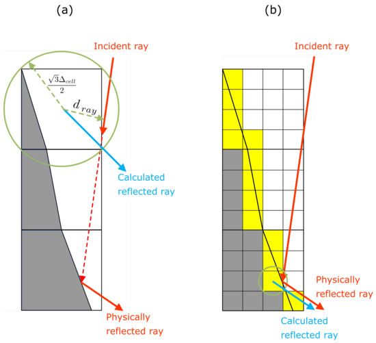 In the first step of the ray-tracing algorithm, all potential reflection cells are selected by applying the condition defined in Equation (5) and using . Subsequently, the selected cells are further divided into virtual cells with a typical cell size of . The virtual cells on the free surface are identified by Equation (7) and marked in yellow as seen Figure 2b. Note that the cells in Figure 2b marked in gray are the cells excluded from the calculation of the reflection point. In the last step, the reflection point is determined among the selected cells by repeating step one with the virtual mesh cell size .