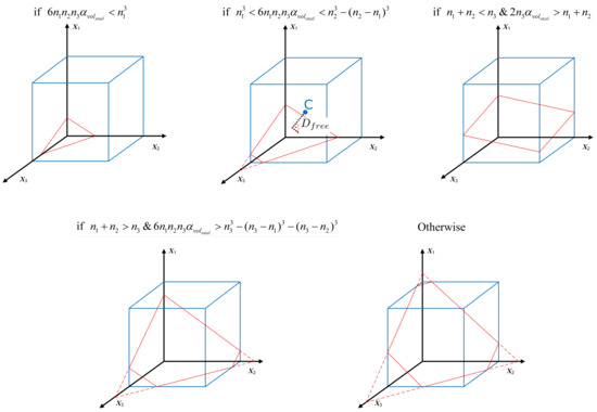 By assuming the free surface to be a piecewise linear interface, the distance between the cell center and the free surface within the cell, (see Figure 3) can be determined uniquely by using the volume fraction of the steel phase and its gradient, , given as [62]. Taking the cell center as the origin and substituting as the maximum, median, and minimum values from , five scalar conditions are obtained, as shown in Figure 3. These can be expressed as: