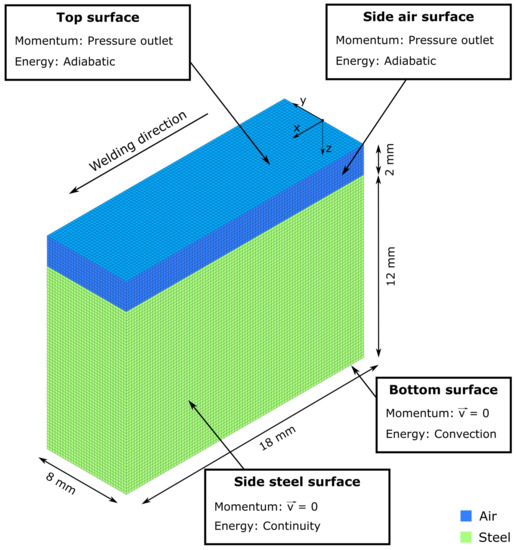 The boundaries of the air-phase domain were set as pressure outlets and on the bottom of the steel-phase domain, convective heat transfer was considered. The simulation domain was smaller than the real steel sheets to optimize the computational time. Hence, a proper treatment of the boundaries was ensured by utilizing the continuity boundary condition [63]. The boundary conditions are also shown in Figure 4.