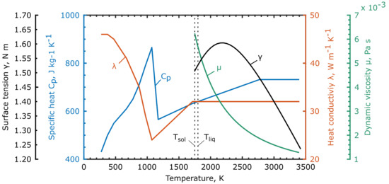 - Mills, K.C. Recommended Values of Thermophysical Properties for Selected Commercial Alloys; Woodhead Publishing: Shaxton, UK, 2002. [Google Scholar]