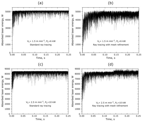 First, the process efficiencies for both welding parameters, given in Table 2, with the different ray tracing algorithms described above are calculated and compared. However, although different welding parameters were used, the line energy was kept equal. A closer look at Figure 6 shows that there are much less fluctuations in the amount of absorbed energy predicted by the standard ray tracing method compared to the virtually improved algorithm, for both low and high process speeds. There were almost constant maximum values of the absorbed laser energy during the simulation with the standard algorithm; see Figure 6a,c. In contrast, the simulation with the virtual mesh refinement does not have clearly pronounced maximum value for the absorbed energy; see Figure 6b,d. Strictly speaking, this means that in the calculations with the virtually refined ray tracing method, more sub-rays are either reaching the keyhole bottom or have been reflected out of it, leading to fluctuations around the averaged value of the absorbed laser energy. Hence, the averaged values of the absorbed amount of laser energy obtained with the improved ray tracing method are slightly lower than those predicted by the standard algorithm. The averaged values at the lower process speed of −1 are 83% and 76% for the standard and virtually refined method, respectively. At the higher process speed of −1, the differences are even smaller, with 83% for the standard and 81% for the virtually refined approach. Note that all calculated process efficiencies lie within the experimental range of measurements at similar process conditions; see, e.g., [67]. Thus, no conclusive statement regarding the physicality and accuracy of the ray tracing algorithms can be given.