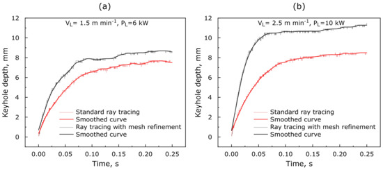 In the next step, the drilling curves and speeds predicted by the standard and virtually refined ray tracing algorithms are compared and analysed. As seen in Figure 7a, at lower process speed, both algorithms deliver similar results. The penetration depth reached is about and for the standard and virtually refined methods, respectively. Furthermore, the drilling speed in the first 50 of the simulation, estimated from the slopes of the drilling curves, seems to be similar for both ray tracing methods (94 −1 vs. 124 −1). On the other hand, a closer look at the results obtained for LBW at higher process speeds (Figure 7b) shows much bigger differences in the final penetration depth as well as in the drilling speed. The deviation of the penetration depth is about 3 , and the drilling speed is almost two times higher in the simulation utilizing the virtually refined technique (114 −1 vs. 196 −1). This result is surprising, since both welding parameter sets had the same line energies, and the differences of the calculated process efficiencies were negligible from a practical point of view.