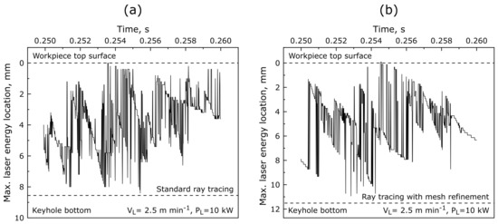In order to reveal the physical reasons for the different accuracy of the ray tracing algorithms regarding the predicted penetration depths, the energy distribution in the keyhole is studied in detail for both methods. In Figure 9, the location of the maximum laser energy during LBW at −1 is exemplarily plotted in the time interval between and for the standard and virtually refined algorithm. Note that the maximum value of the absorbed laser energy is used for the analysis since it provides comprehensive information about the keyhole geometry as well. For example, according to the basic principles of the LBW process, the ablation of the front keyhole wall is directly connected with the movement of the maximum laser energy location from the top to the bottom region of the keyhole. Once the the energy is concentrated on the keyhole bottom, the keyhole depth increases, allowing for the deep-penetration LBW [68]. Thus, the ablation process of the front keyhole wall is crucial for the LBW process, especially during welding of thick plates, when it is most pronounced.
