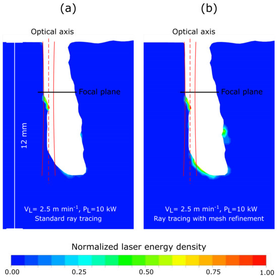 Distribution of the laser energy calculated with the (a) standard and (b) virtually refined ray tracing algorithms on a predefined keyhole geometry.