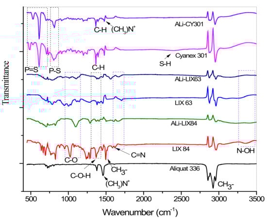 In order to investigate the formation of ILs, the FT-IR spectra (FT-IR-Vertex 80 V, Bruker, Leipzig, Germany) of individual extractants and synthesized ILs were analyzed. The ILs were synthesized when the interaction occurred in functional groups of a single extractant such as LIX 63/LIX 84/Cyanex 301 and Aliquat 336, leading to some changes in the characteristic groups. Therefore, the changes in the characteristic bands of the acidic/oxime extractants before and after being mixed with Aliquat 336 were recorded and are shown in Figure 1 and Table 1. The region of 3500–500 cm−1 spectra was analyzed in more detail, where changes were observed. The data show that there was a significant change in the characteristic bands of the synthesized ILs, denoting that LIX 63/LIX 84 and Cyanex 301 reacted with Aliquat 336 to form ILs. The evidence is the occurrence of a significant change in the range of P–S, P=S, S–H (thiophosphinic group) and C–O, C–OH, C=N (oxime group). It is easier to observe the transformation of the C–OH group of LIX 84 than that of LIX 63 because this functional group (–OH) directly links to the benzene cycle, which makes this hydroxyl group more active and easier to participate in chemical reaction. Moreover, the drastic decrease in the intensities or even disappearance of the (CH3)+N peak at 1463 cm−1 of Aliquat 336 was observed after synthesis of ILs, indicating the occurrence of strong and effective interaction at that position. This also agrees well with the reported spectra data []. From the evidence of significant changes on characteristic bands, it can be verified that the targeted ILs were successfully synthesized from the reactants.