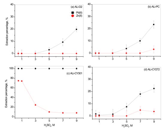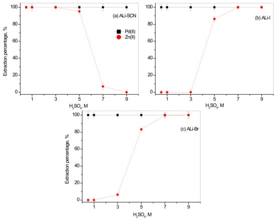 Figure 6b,c show that the extraction percentage of Pd(II) increased from 63.6% to 100% and from 39.9% to 100% when the concentration of ALi–I and ALi–Br increased from 0.001 to 0.005 M, then remained constant with the increase of ILs concentration. In these conditions, no Zn(II) was extracted and complete separation of Pd(II) and Zn(II) was possible. Our results indicate that both the synthesized ILs with organic (ALi–CY301, ALi–LIX63 and ALi–LIX84) and inorganic anions (ALi–SCN, ALi–I and ALi–Br) are effective in separating Pd(II) and Zn(II) from sulfuric acid solutions. Herein, ALi–I and ALi–Br are the best as an extractant for separating Pd(II) and Zn(II) when H2SO4 concentration is lower than 3 M, while ALi–CY301 and ALi–SCN are good when H2SO4 concentration is higher than 7 M. Especially, ALi–LIX63 and ALi–LIX84 can selectively extract Pd(II) from H2SO4 concentration in the range from 0.5 to 9 M, while Zn(II) was not extracted at all.