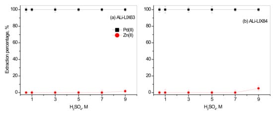 In Figure 3, Pd(II) was completely extracted by ALi–LIX63 and ALi–LIX84, while Zn(II) extraction was negligible in the H2SO4 concentration range of 0.5 to 9 M. Zn(II) extraction by ALi–LIX84 increased from zero to 5.1% when H2SO4 concentration increased from 7 to 9 M. The extraction reaction of Pd(II) by ALi–LIX63 and ALi–LIX84 can be proposed as: