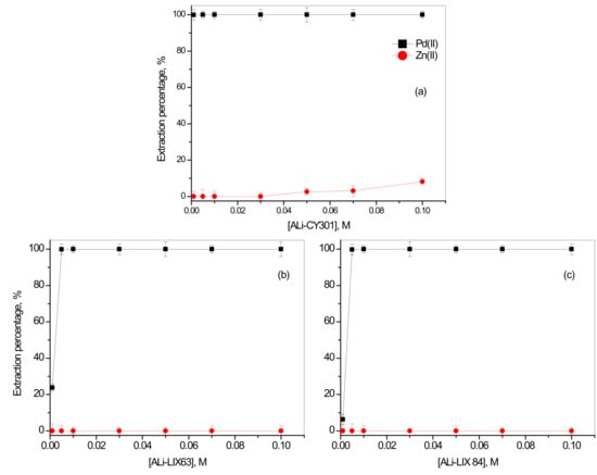 Effect of (a) ALi–CY301, (b) ALi–LIX63 and (c) ALi–LIX84 concentration on extraction of Pd(II) and Zn(II). Conditions: [extractant] = 0.001–0.1 M, diluent: kerosene; modifier: decanol 10% v/v. A/O = 1, (a) 7 M H2SO4, (b,c) 0.5 M H2SO4 [Pd(II)] = 100 mg/L and [Zn(II)] = 500 mg/L.