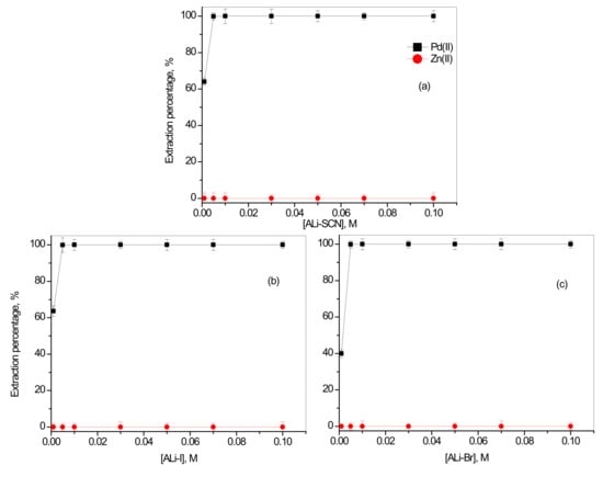 In these experiments, IL concentration was varied from 0.001 to 0.1 M and the concentration of H2SO4 in synthetic leaching solution was controlled for each employed IL (0.5 M H2SO4 for ALi–I and ALi–Br and 9 M for ALi–SCN). The concentrations of Pd(II) and Zn(II) in the synthetic leaching solution were 100 and 500 mg/L, respectively. The volume ratio of the organic to aqueous phase was kept at unity. The results indicated that Pd(II) extraction percentage is a function of ALi–SCN concentration. As seen in Figure 6a, the extraction percentage of Pd(II) increased from 64% to 100% when the concentration of ALi–SCN increased from 0.001 to 0.005 M, and then remained constant with the increase of ALi–SCN. Zn(II) was not extracted at all in these conditions.