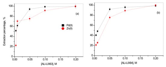 Effect of (a) ALi–LIX63 and (b) ALi–LIX84 concentration on extraction of Pd(II) and Zn(II). Conditions: [extractant] = 0.005–0.2 M, diluent: kerosene; modifier: decanol 10% v/v. A/O = 1, real leaching solution of 5 M H2SO4 and 1.5% NaClO; [Pd(II)] = 1926 mg/L and [Zn(II)] = 74 mg/L.