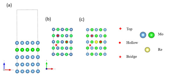 The Mo (110) surface was used to explore the interaction between Na/O atoms and the Mo substrate because the Mo (110) surface has the lowest surface energy as reported in Materials Project Database [31]. Mo (110)-(2 × 2) surface cell was represented by a 5-layers slab model (8 atoms per layer) with the vacuum thickness of 10 Å. The upper two layers were fully relaxed and the bottom three layers were fixed as the bulk phase during structure optimization. In this study, we also investigated the effect of alloy element Re on the adsorption of Na and O atoms. For Mo-Re alloy, when the weight percentage of Re is less than 14%, Re atoms randomly replace Mo atoms at the lattice site [32]. We considered three adsorption sites for the Na and O atom on Mo/Mo-Re alloy: TOP site, Bridge site and Hollow site of Mo/Mo-Re (110) surface. Top site is located over the Mo atoms of the topmost layer, and bridge site is located between the two Mo atoms of the topmost layer, while Hollow site is above the Mo atoms of the second layer, as is shown in Figure 1. For one atom adsorbed on the (110)-(2 × 1) surface cell, the corresponding coverage () is ML.