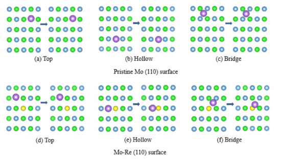 Initial and final configurations of Na adsorption on Mo (110) and Mo-Re (110) surfaces. Snaps (a–c) show Na atoms initially placed at Top site, Hollow site and Bridge site of Mo (110) surface. Snaps (d–f) show Na atoms initially placed at Top site, Hollow site and Bridge site of Mo-Re (110) surface. Blue and green spheres represent Mo atoms in the first layer and the second layer. Yellow and purple spheres represent Re atoms and Na atoms, respectively.